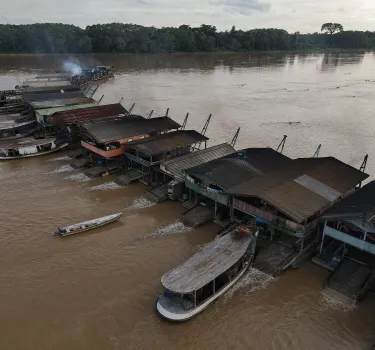 Es domingo en uno de estos lugares de cotilleo ("fofoca") en el río Madeira, en la Amazonía de Brasil. Las balsas están dispuestas una junto a la otra, formando una plataforma alargada donde es posible caminar de un extremo a otro. Están ancladas y atadas con cables de acero y cuerdas resistentes para evitar que la fuerza del agua, la corriente o la lluvia las arrastren todo hacia las profundidades del río.