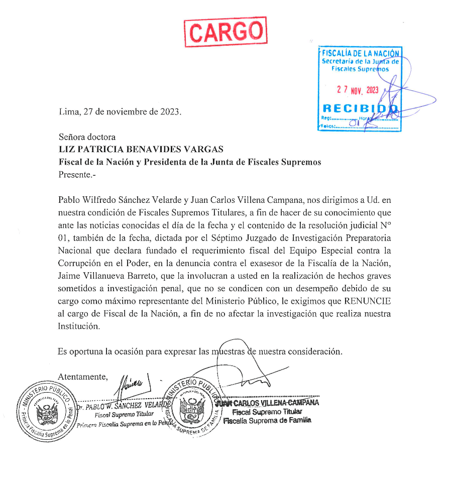 En una carta dirigida a la fiscal de la nación, Patricia Benavides Vargas, los fiscales supremos Pablo Sánchez Velarde y Juan Carlos Villena Campana exigieron su renuncia del cargo luego de que se conociera el megaoperativo en el que se encuentra implicada la titular del Ministerio Público y tres de sus asesores.