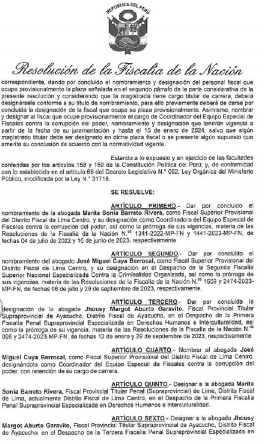 Además, Barreto Rivera está a cargo de las indagaciones al entorno de Pedro Castillo y la presidenta Dina Boluarte. Durante la madrugada, Patricia Benavides ordenó que sea trasladada a la Primera Fiscalía Penal Supraprovincial Especializada en Derechos Humanos e Interculturalidad.
