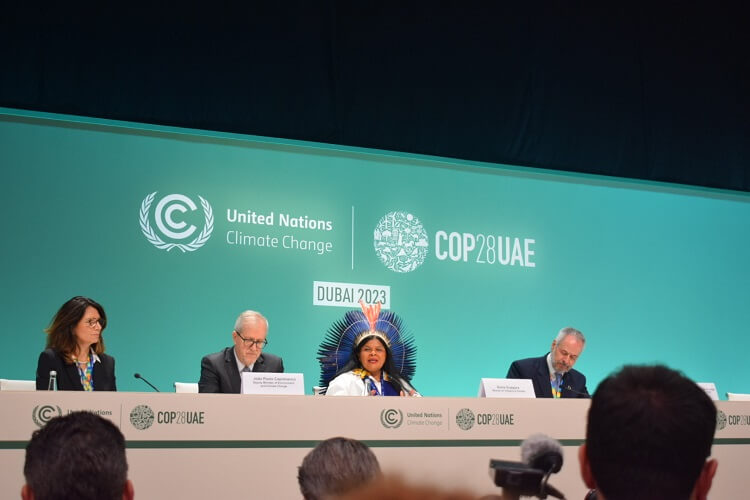 Además de ello, el pabellón de Brasil presentó a representantes de la empresa minera Vale, responsables de crímenes socioambientales en la Amazonía brasileña. “Ustedes hablan de transición de transición energética, hablan de conservación del planeta, pero son ustedes que corrompen la institución. Ustedes hablan y hablan, pero en la práctica, todos los días ponen nuestras vidas en riesgo”, recordó Thiago Guarani del Territorio Indígena Jaraguá (Sao Paulo) frente al pabellón de Brasil en la COP28.